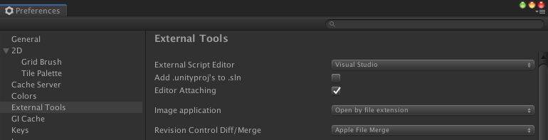기본 설정에 Add .unityproj's to .sln 값이 false 로 되어 있는 것을 true 로 변경해 주면 visual studio 를 통해 실행된다.