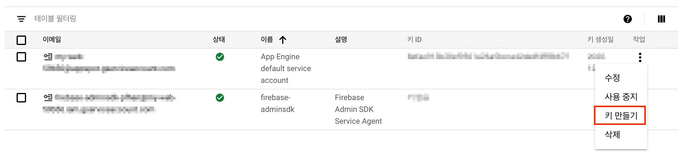 key.json 파일은 Service Accounts pane 의 App Engine default service account 키 값을 받아서 사용하면 된다고 함