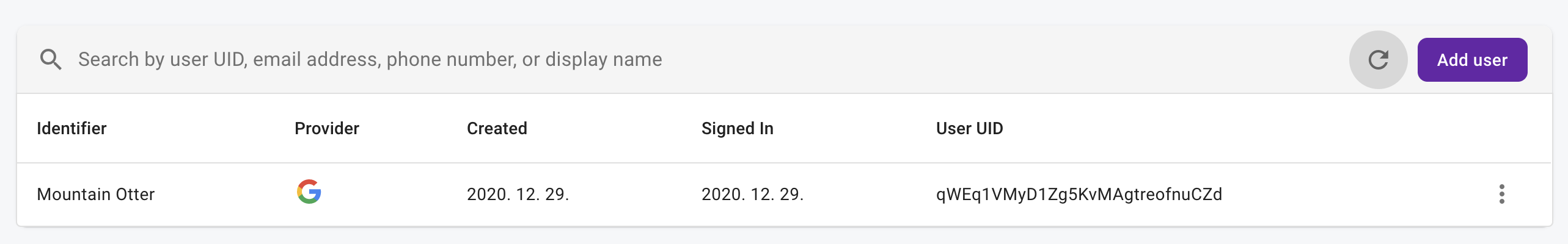 여기서 신규 계정 생성 후 테스트 UI 의 Authentication 탭에 가보면 생성한 계정이 에뮬레이터에 등록된 것을 확인할 수 있음
