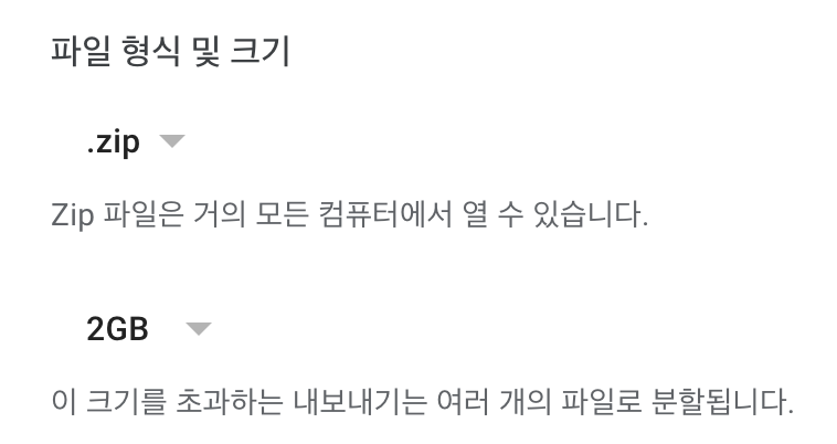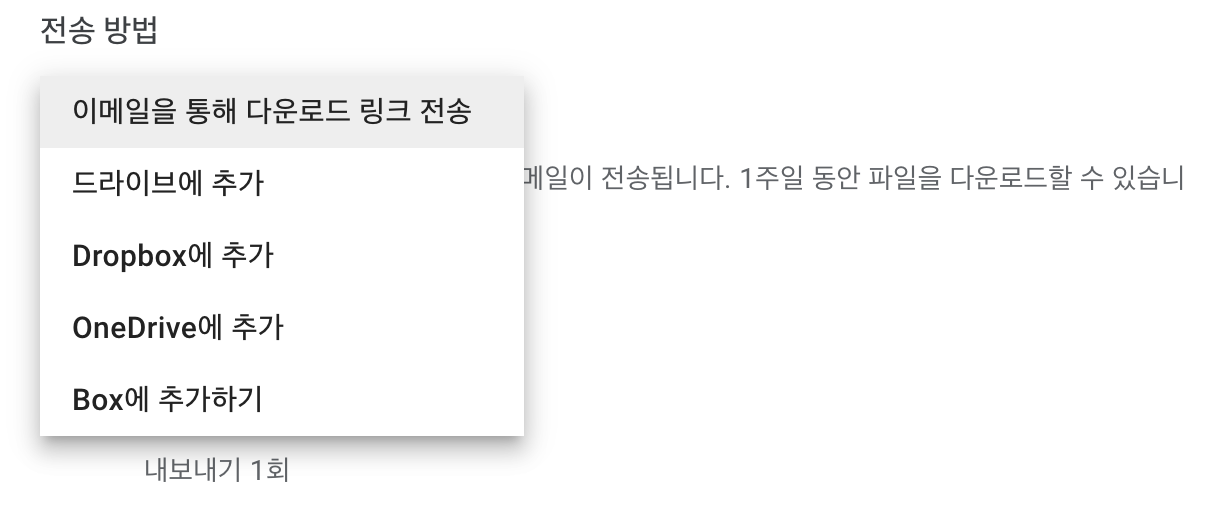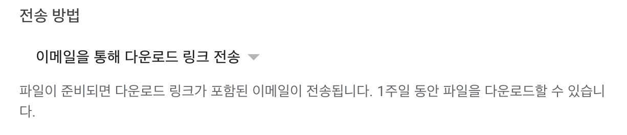우선 선택한 데이터의 전송 방법을 선택한다. 어떤 방식으로 Google 포토의 사진들을 다운 받을지 선택 할 수 있다.