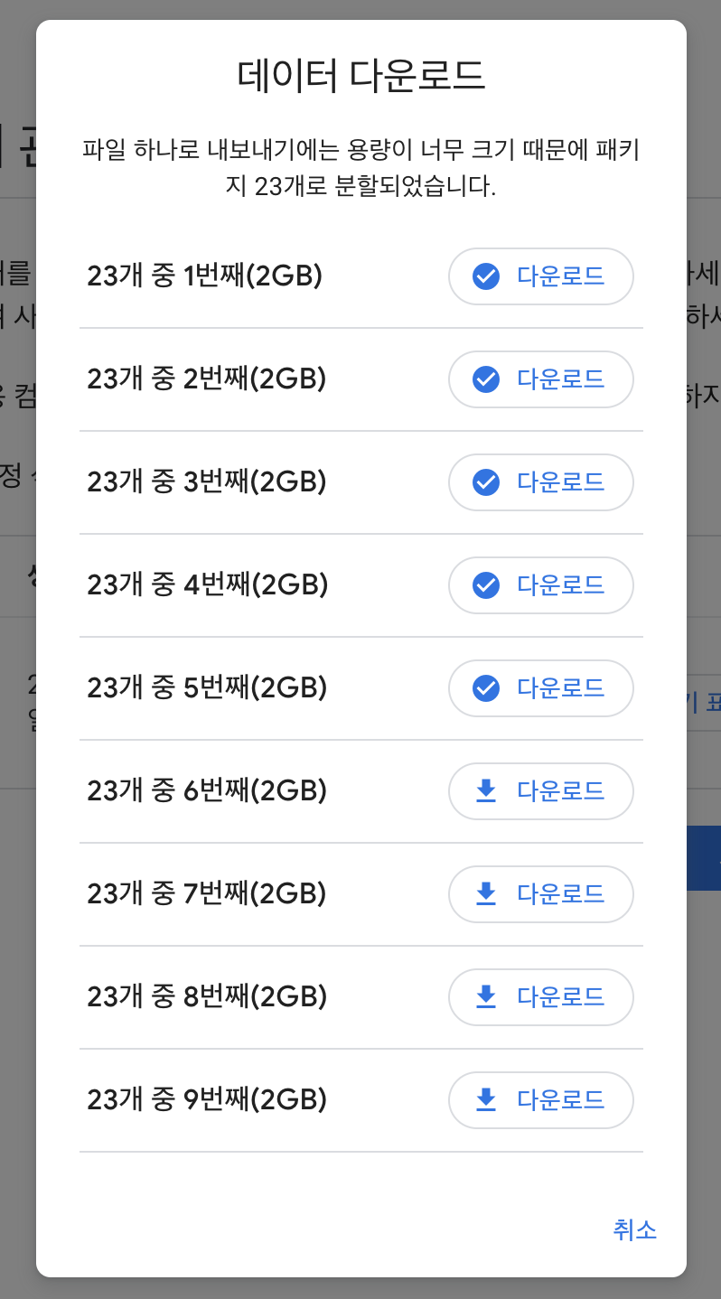 링크를 클릭하면 데이터 다운로드 신청을 진행했던 Google 테이크아웃 페이지로 리다이렉션 되고, 다음과 같이 다운받는 링크들을 보여준다. 어디까지 받았는지 표시도 되기 때문에 꽤 친절하게 되어 있다.