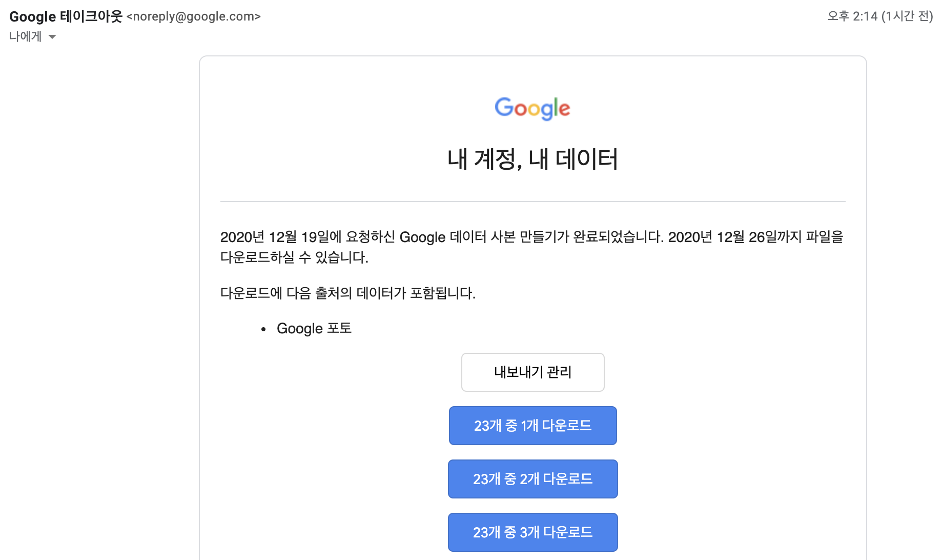 이제 하단의 "내보내기 생성" 버튼을 누르고 메일이 오길 기다리면 된다. 일정 시간이 흐르고 메일이 오면 다음과 같이 다운로드 링크가 포함된 메일이 도착한다.