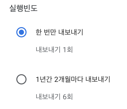 다음으로 실행 빈도를 선택할 수 있다. 사진을 다운 받는 목적이 별도의 백업을 위한 것이 아닌 단순 이동이기 때문에 "한 번만 내보내기"를 선택해 현재 Google 포토에 백업된 사진을 모두 내보내게 한다.