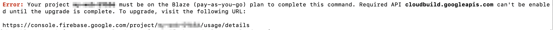 아래 에러는 Firebase 요금제가 Blaze 요금제가 아니어서 생기는 에러 입니다. 기본 요금제가 Blaze 가 아니기 때문에 확인하고 변경해 줘야 합니다.