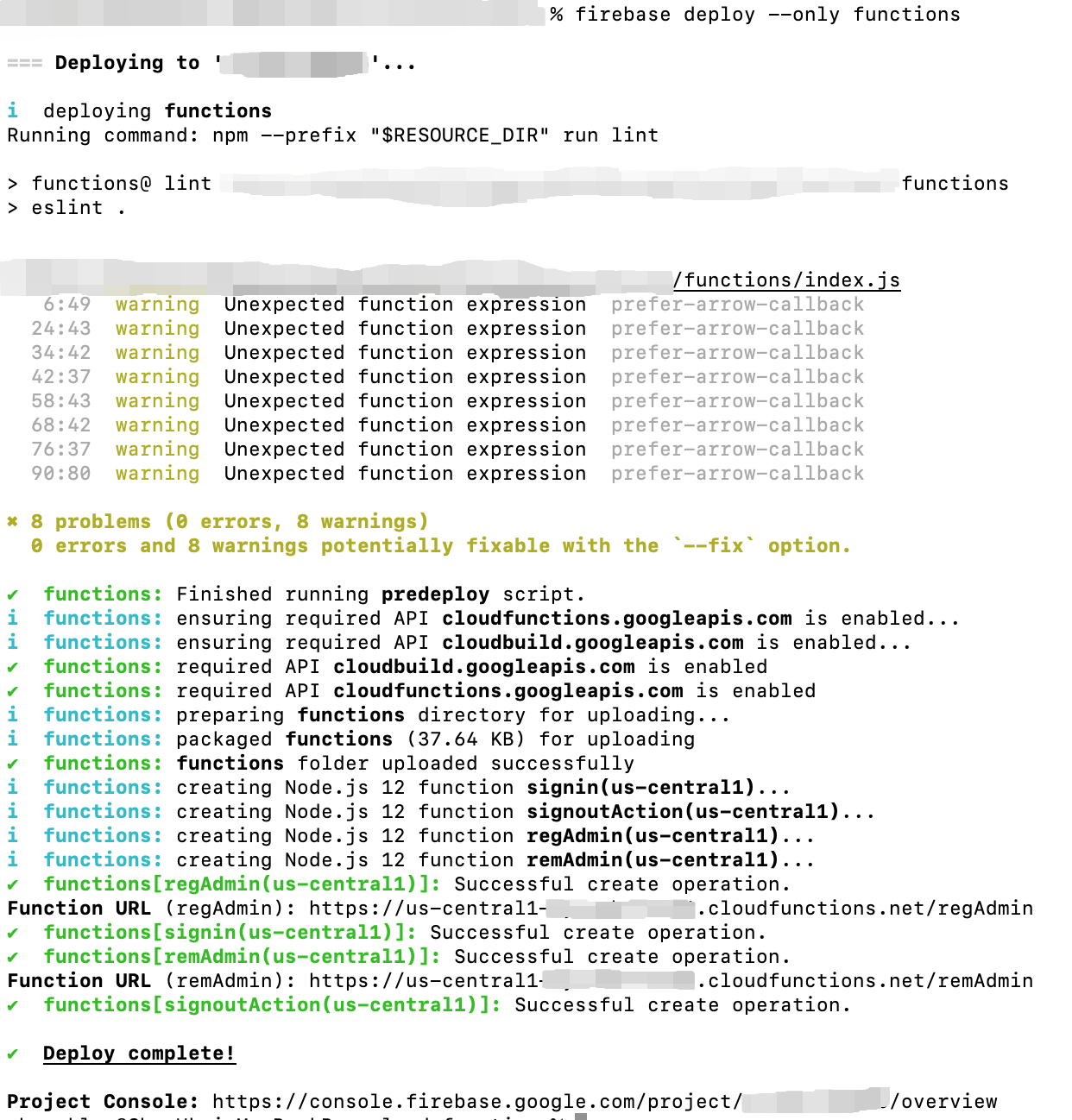로컬에서 작업한 Cloude Function 을 배포하려면 작업 경로에서 firebase deploy --only functions 을 호출 해주면 됩니다.
