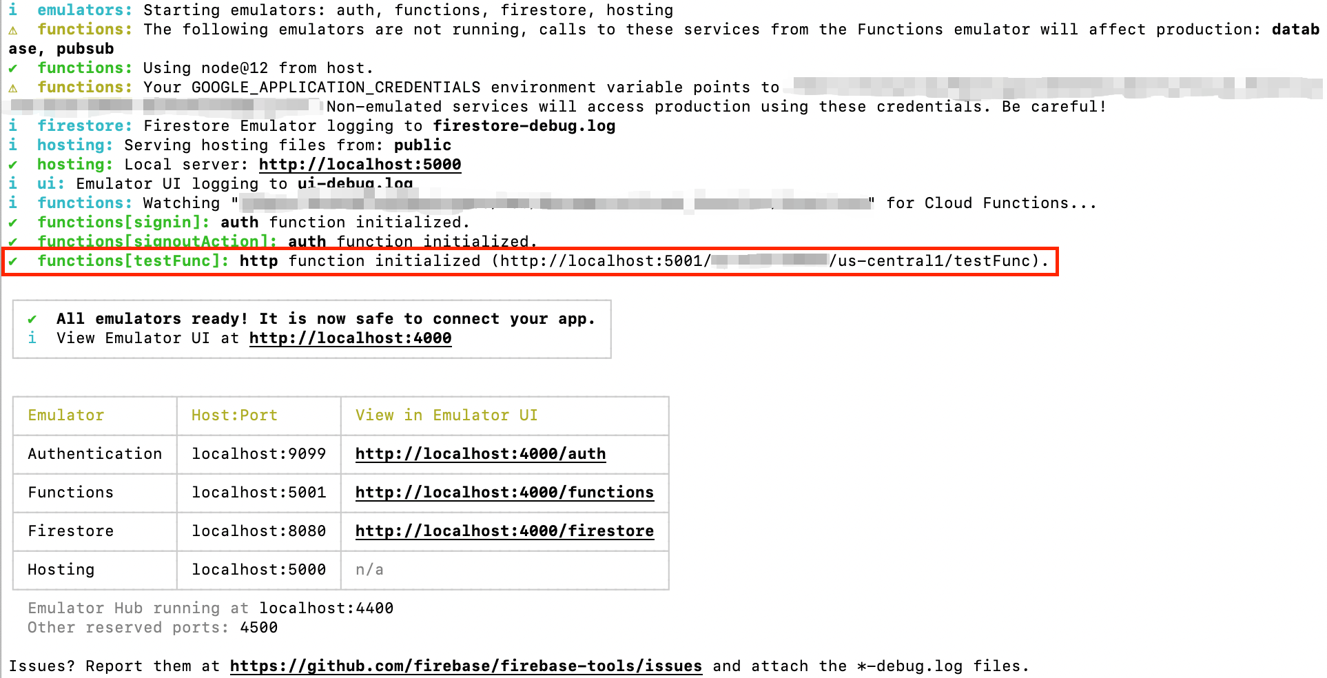 추가된 Function 은 에뮬레이터 시작시 확인할 수 있습니다. 아래와 같이 "http function instialized (URL/testFunc)" 형태로 나옵니다.