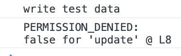 우선은 관리자 등록을 하지않고 쓰기에 실패하는지 확인합니다. 로그를 보면 PERMISSION_DENIED 가 뜨는 것을 알 수 있습니다.