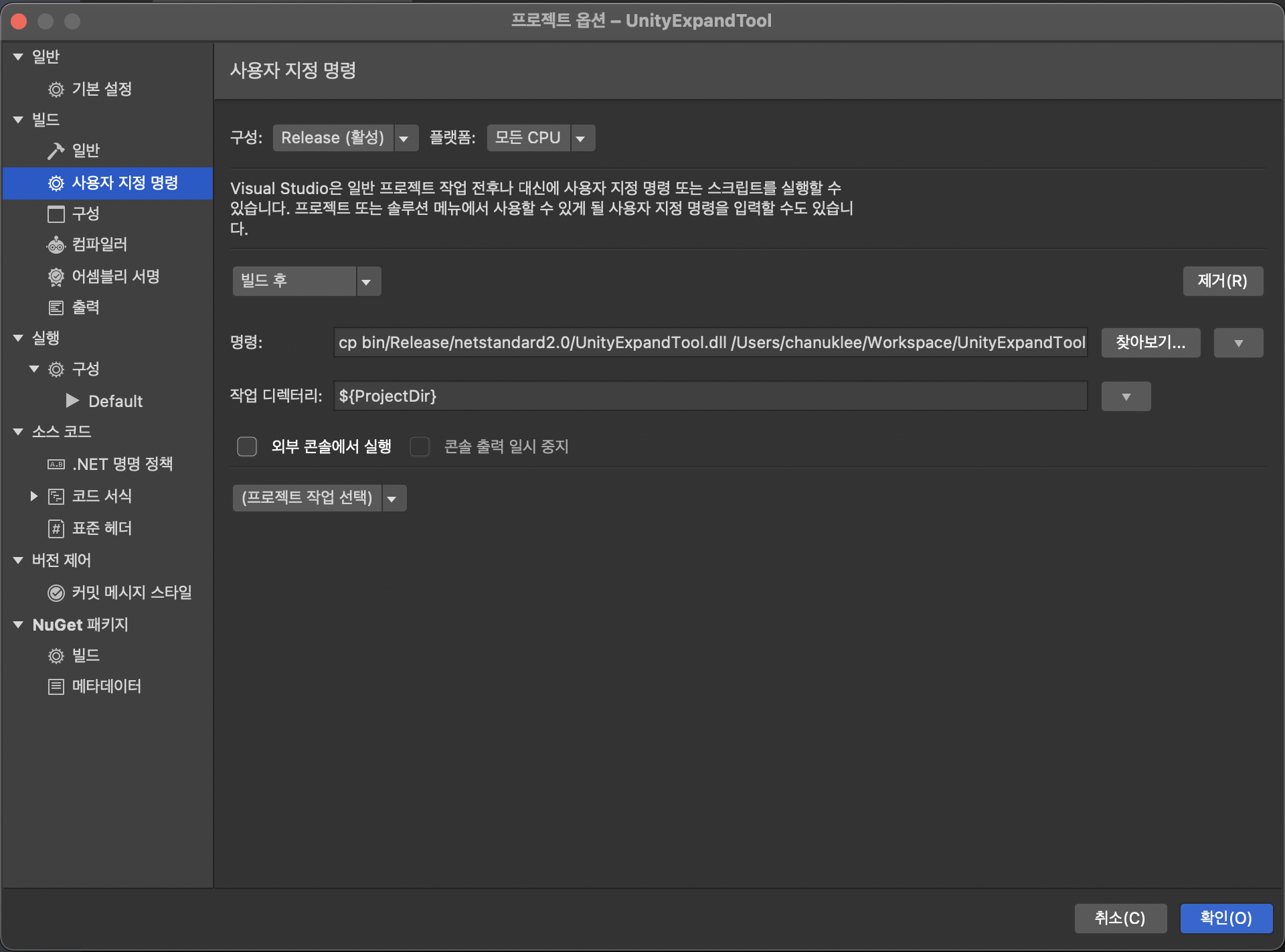 Debug 에서 작성한 C# 코드를 링크시켜 라이브러리로 빌드시킬 수 있는 설정을 해 둔 Visual Studio Project 이다. 빌드 후 생성된 DLL 파일은 Post Build 기능을 사용해 Release 에 적용되도록 구성하였다.