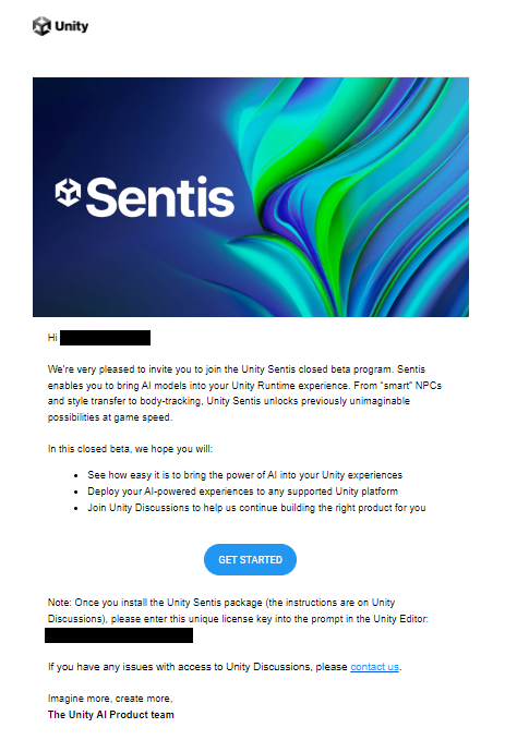 Unity AI Beta 신청을 하고 나서 참여 메일을 받으면 Sentis Package 활성화에 필요한 license key 를 발급 받을 수 있다.