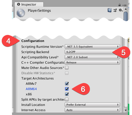 3. PlayerSettings Panel(플레잉어 설정 패널) > Settings for Android(Android용 설정) > Other settings(기타 설정) > Configuration(구성) 으로 이동합니다.