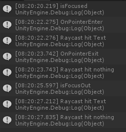 | using System.Collections.Generic; using UnityEngine; using UnityEngine.EventSystems; public class FSelectable : MonoBehaviour, IPointerEnterHandler, IPointerClickHandler, IPointerExitHandler { private List _raycastResults = new List(); private int _prevRaycastResultCount = 0; public void OnPointerClick(PointerEventData eventData) { Debug.Log("OnPointerClick"); } public void OnPointerEnter(PointerEventData eventData) { Debug.Log("OnPointerEnter"); } public void OnPointerExit(PointerEventData eventData) { Debug.Log("OnPointerExit"); } public void OnApplicationFocus(bool focus) { if (focus == true) { Debug.Log("isFocused"); } else { Debug.Log("isFocusOut"); } } public void Update() { if (EventSystem.current == null) return; PointerEventData eventData = new PointerEventData(EventSystem.current); if (eventData == null) return; eventData.position = Input.mousePosition; EventSystem.current.RaycastAll(eventData, _raycastResults); if (_prevRaycastResultCount != _raycastResults.Count) { _prevRaycastResultCount = _raycastResults.Count; if (_raycastResults.Count > 0) { Debug.Log(string.Format("Raycast hit {0}", _raycastResults[0].gameObject.name)); } else { Debug.Log("Raycast hit nothing"); } } } } |