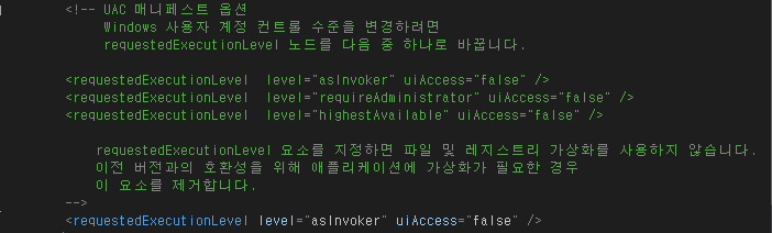 app.manifest 를 열어 requestedExecutionLevel의 level 값을 asInvoker 에서 requireAdministrator 로 변경 합니다.