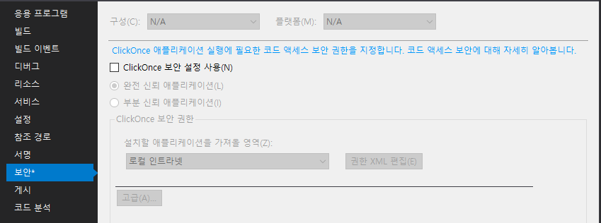 프로젝트 > 속성 메뉴에서 보안 탭으로 이동 후 ClickOnce 보안 설정 사용을 선택합니다.