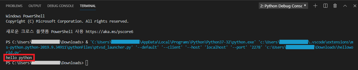 F5를 눌러 빌드하면 하단 Terminal 창에 hello python 이 출력되는 것을 볼 수 있습니다.