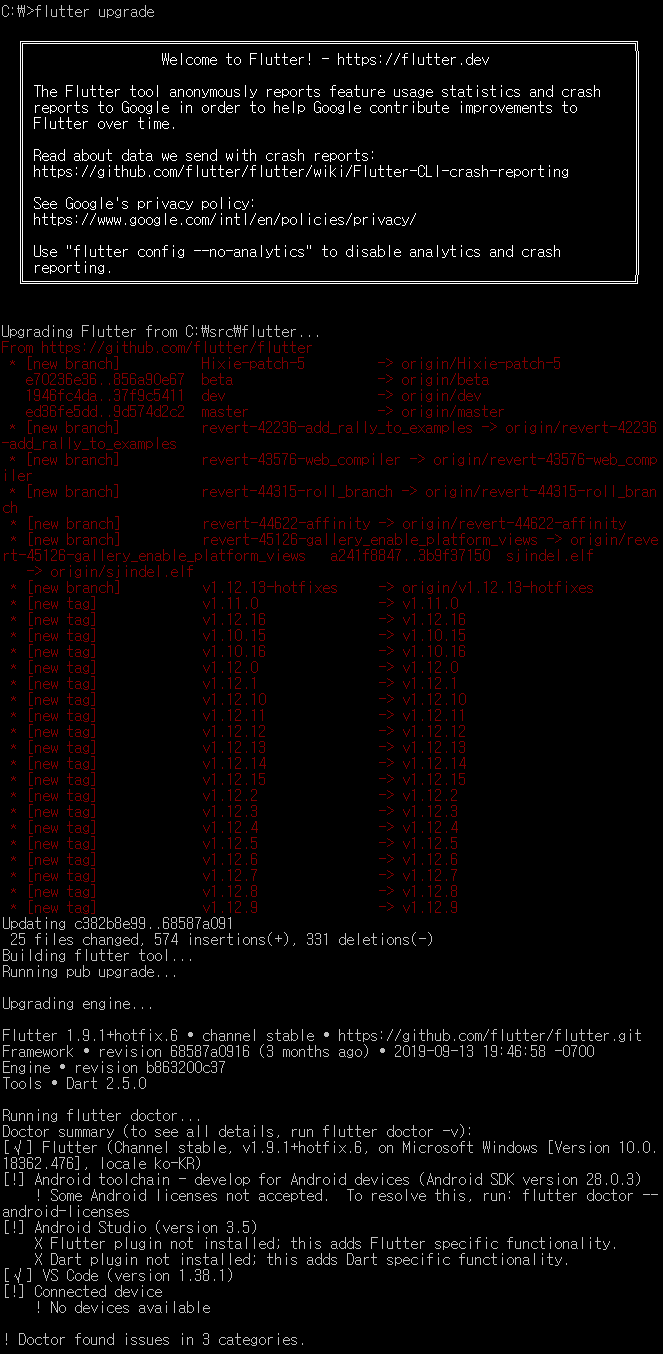 대부분의 내용이 업데이트 된 내용을 패치하는 것이고 중요한 부분은 Running flutter doctor... 부분 부터이다.