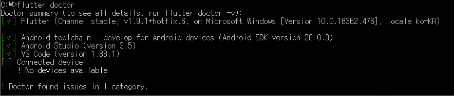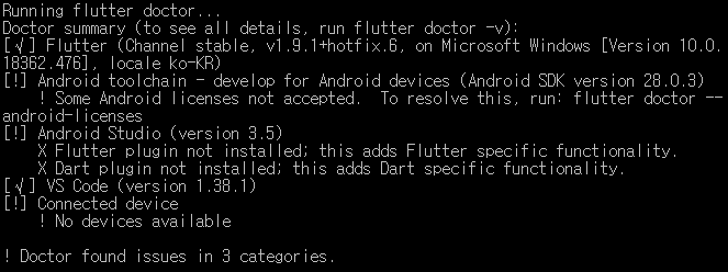 여기까지 완료되었다면 콘솔 창에서 다시한번 flutter doctor 를 쳐보자.