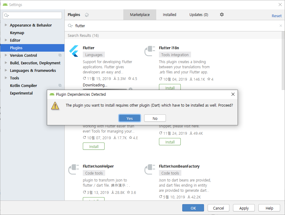 참고로 Flutter 를 설치하려고 하면 Dart 가 필요하니 같이 설치할꺼냐고 물어보는데 Yes 를 눌러주면 둘다 설치가 된다.