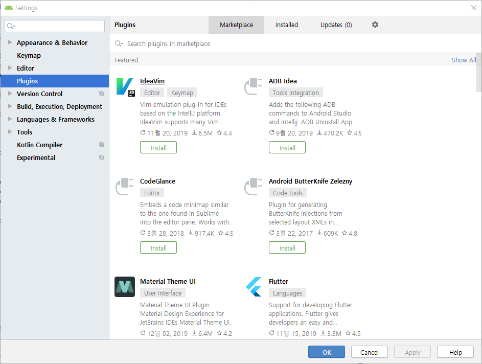 Android Studio 에서 File > Settings > Plugin 항목에 들어가보면 상단 탭에 MarketPlace 라는 것을 선택하고 Flutter 와 Dart 를 찾아 설치해 준다.