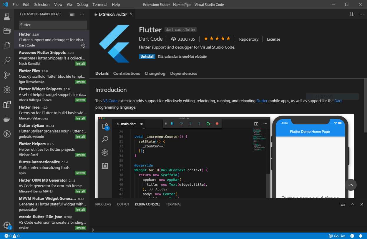 VSCode 는 잘 알겠지만 Visual Studio Code 고 여기에 Flutter Extension 를 찾아 설치해 주면 완료된다.