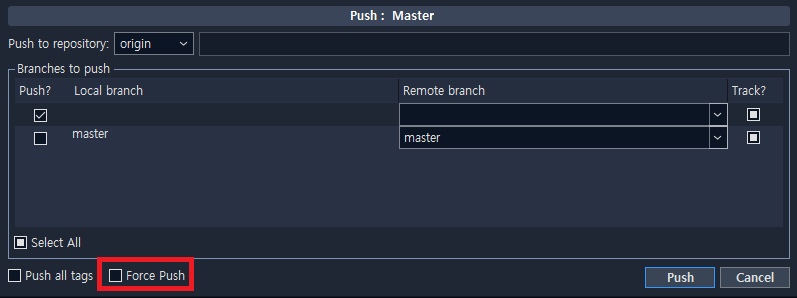 그 다음 Push 를 누르면 뜨는 창에서 하단에 Force Push 를 체크 해주고 Push 하면 Pull 내용을 무시하고 강제로 Push 합니다.