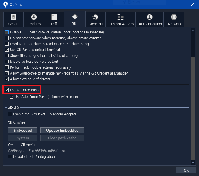 이걸 해결하려면 Force Push 를 해야 하는데 SourceTree 기본 설정은 Disable 상태이므로 옵션에서 Enable 로 바꿔주는 작업을 먼저 해주어야 합니다.