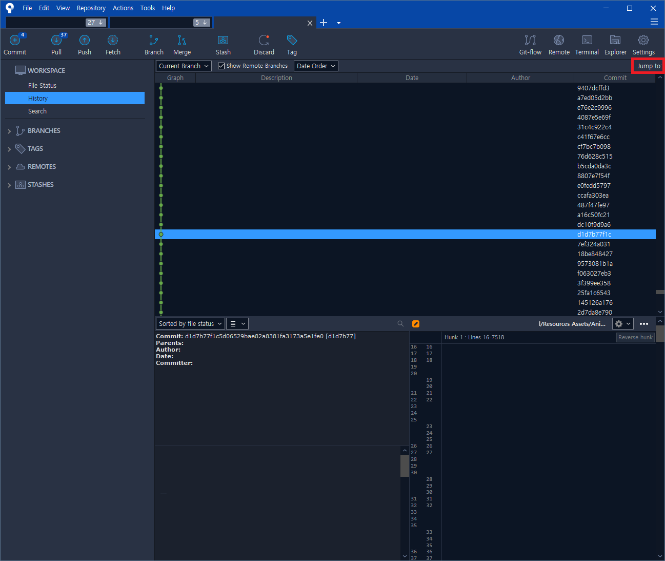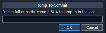 일단 SourceTree Window 의 왼쪽에 Jump to: 라는 버튼을 누르면, 맨 위에 Commit.. 그 아래로 Brach 를 선택 할 수 있는 목록이 나온다. 여기서 Commit... 을 선택하면 Jump To Commit 팝업 창이 뜨고 여기에 Hash Key 값을 입력하면 일치하는 Commit 을 찾아 준다.