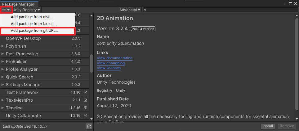 Unity Editor > Windows > Package Manager > Add package from git URL