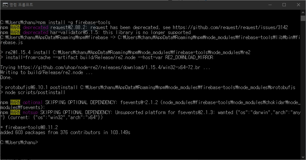 - 커맨드 > npm install -g firebase-tools